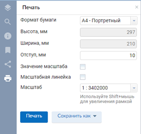 При выборе раздела «Печать» можно задать следующие параметры: формат бумаги (высота и ширина), масштаб.